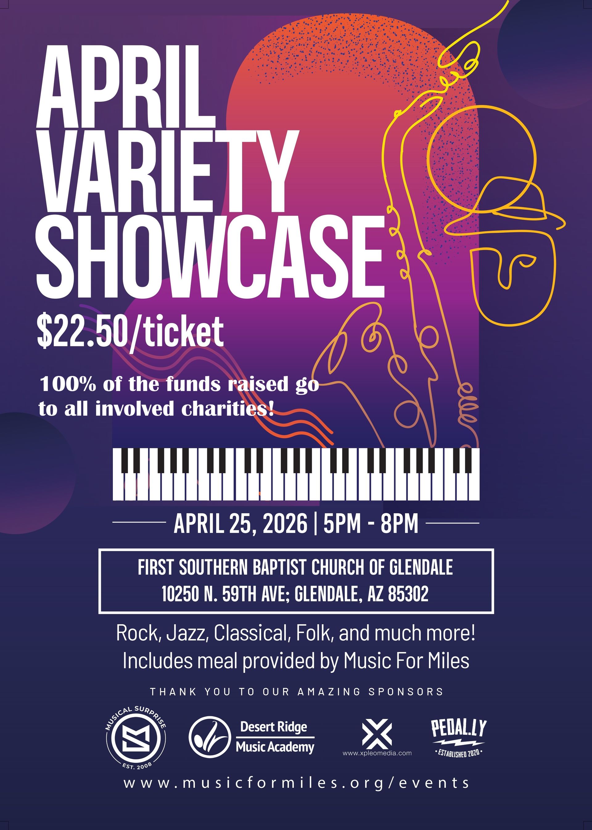 We are thrilled to announce that DRMA is sponsoring Music for Miles for their April Variety Showcase! This special event will feature an incredible mix of rock, jazz, classical, folk, and more, along with a meal provided by Music for Miles.